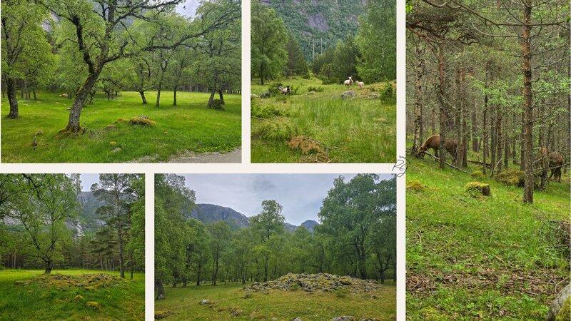 Vom See aus schlugen wir einen kleinen Umweg ein – einen sanften Anstieg über Wiesen und Kieswege hinauf zur Anhöhe Hæreidsmoen, wo sich eines der größten bronzezeitlichen Gräberfelder Westnorwegens befindet. Gravfeltet Hæreidsmoen liegt heute ganz ruhig zwischen Wald, Fels und Weideland – beinahe unscheinbar, wären da nicht die gut erkennbaren Hügelgräber, die sich über das Gelände verteilen.