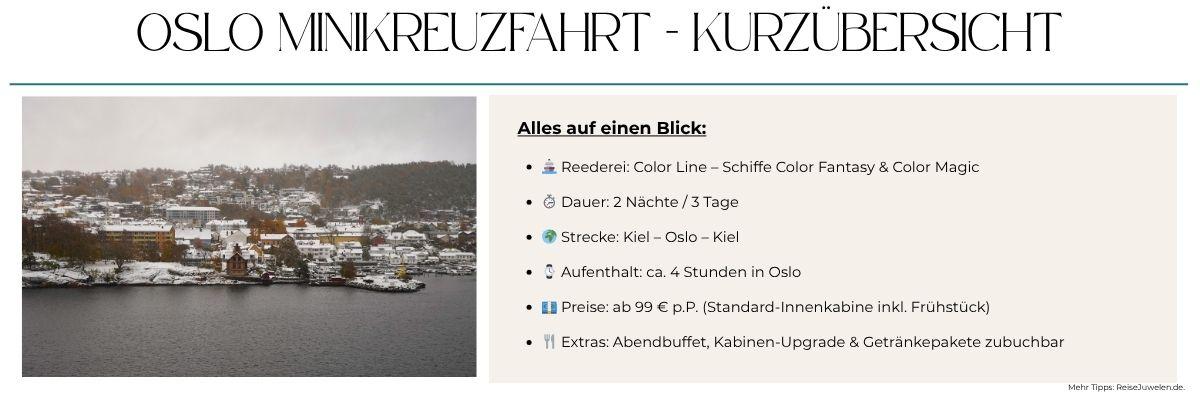 Etwa 4 Stunden. Das reicht für einen Spaziergang durch die Innenstadt, die Oper oder Aker Brygge. Wer mehr sehen möchte, kann die Reise auch mit Hotelübernachtung in Oslo verlängern.
